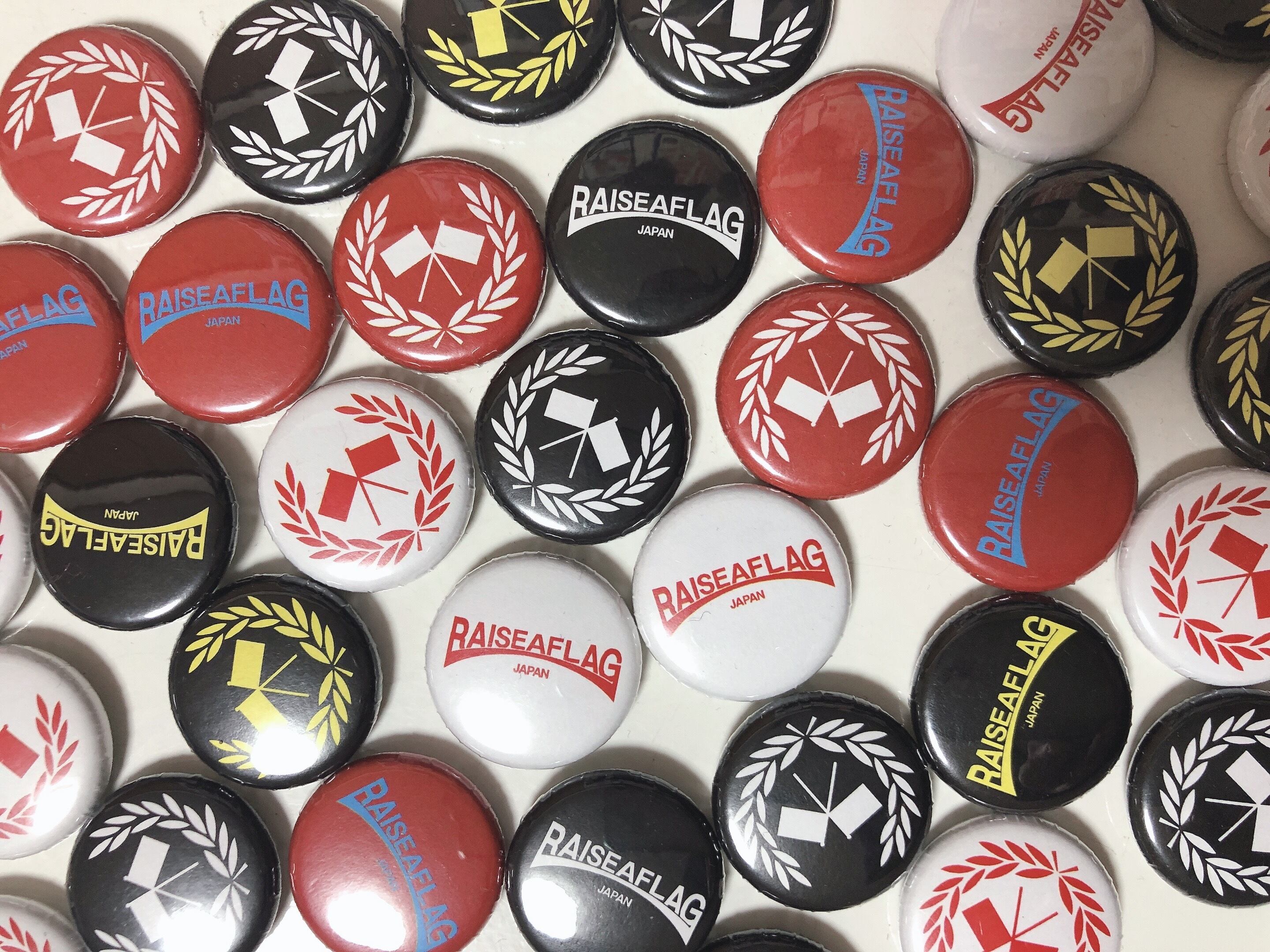 RAISE A FLAG 缶バッジ ボディ白 / ロゴ赤